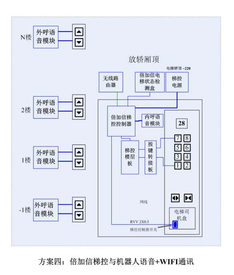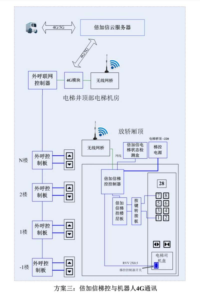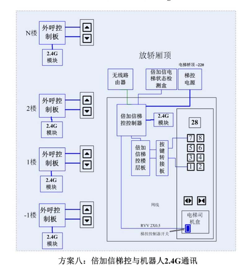 (1)機器人在電梯外,通個Wifi、藍牙、LoRa、Zigbee、2.4G、433M、語音或4G網絡等發送指令倍加信梯控系統,系統自動點亮上樓或下樓按鍵,實現呼梯功能。