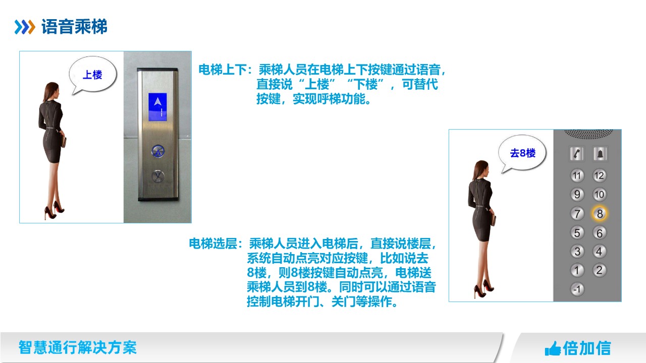 倍加信科技作為專業的梯控系統研發廠家,推出真正零接觸的乘梯方案。不判斷樓層權限,全程通過語音識別實現呼梯和乘梯。